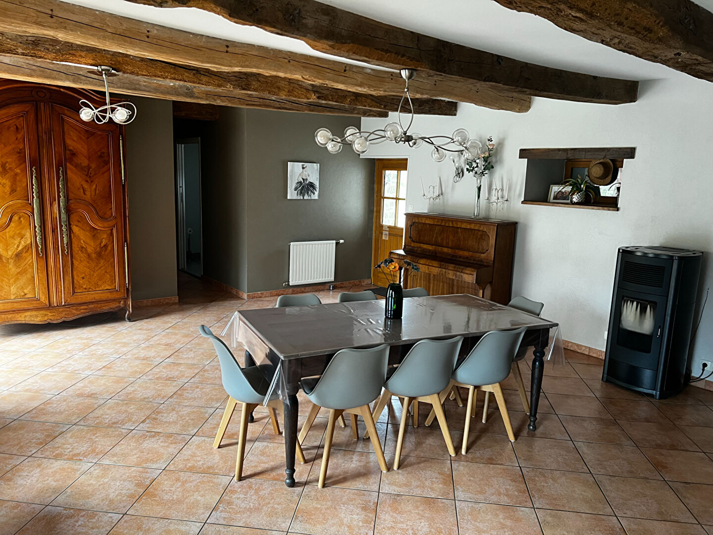 Au RDC : une entrée directe, une cuisine équipée et aménagée avec un poêle à bois et un espace repas, un très grand salon-séjour avec un poêle à granulés, une chaufferie, un dégagement, une buanderie, une SDB avec wc, une chambre.