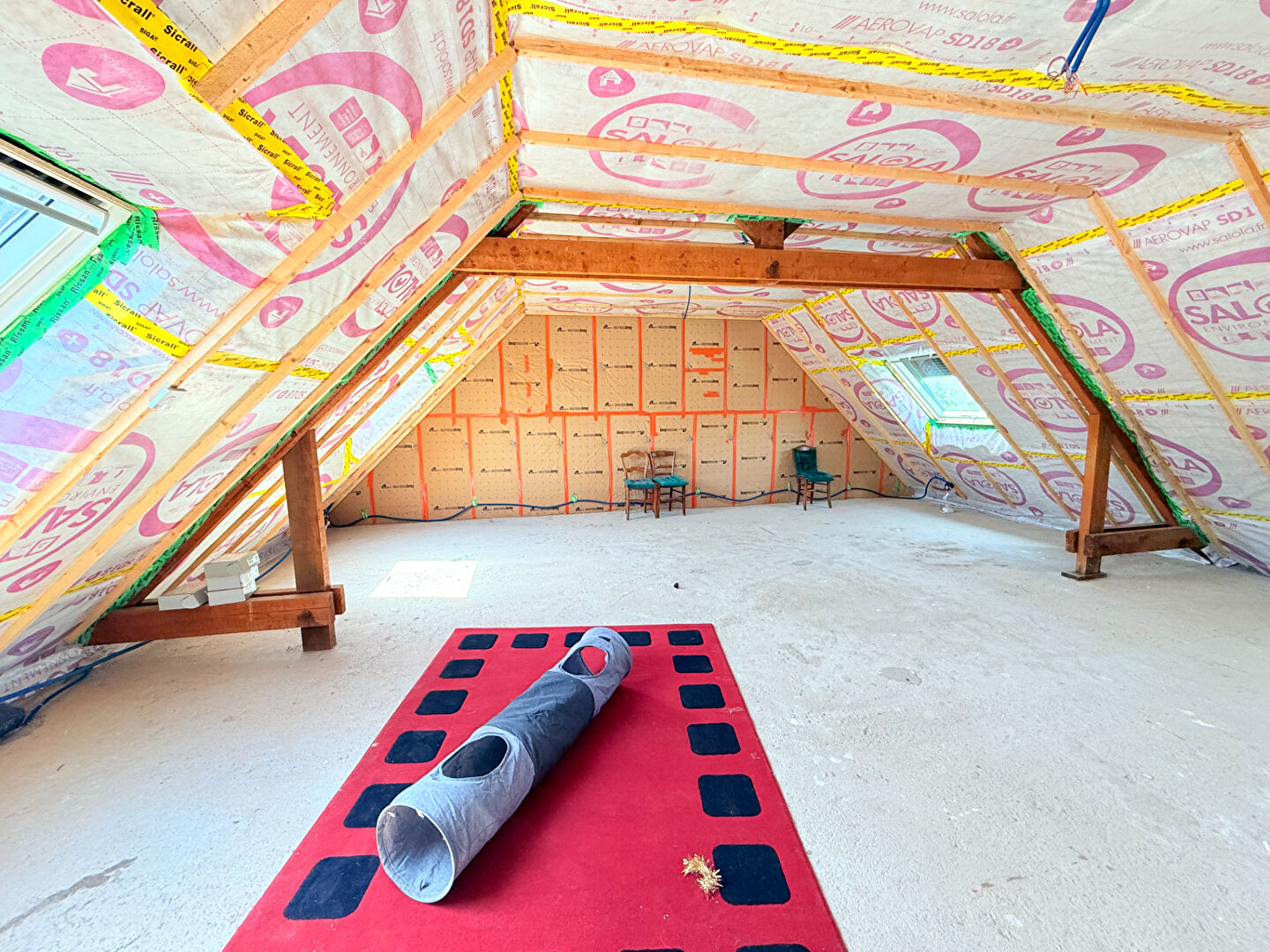 - Sous combles : un espace restant à aménager sur dalle béton avec isolation et velux existants.